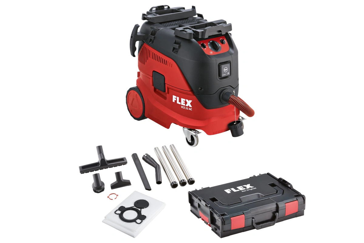 Sicherheitssauger mit automatischer Filterabreinigung der Staubklasse M, Flex Staubsauger VCE 33 M AC inkl. Reinigungsset mit 30L Fassungsvermögen, für Nass-und Trockenbetrieb. Flex-Nummer: 471194. Zubehör: 5x Vlies-Filtersäcke FS-F VCE L/M 1x Reinigungsset 1x 4m Antistatik-Saugschlauch 1x L-BOXX TK-L 102 Förderung der BG Bau möglich bis 200 Euro.