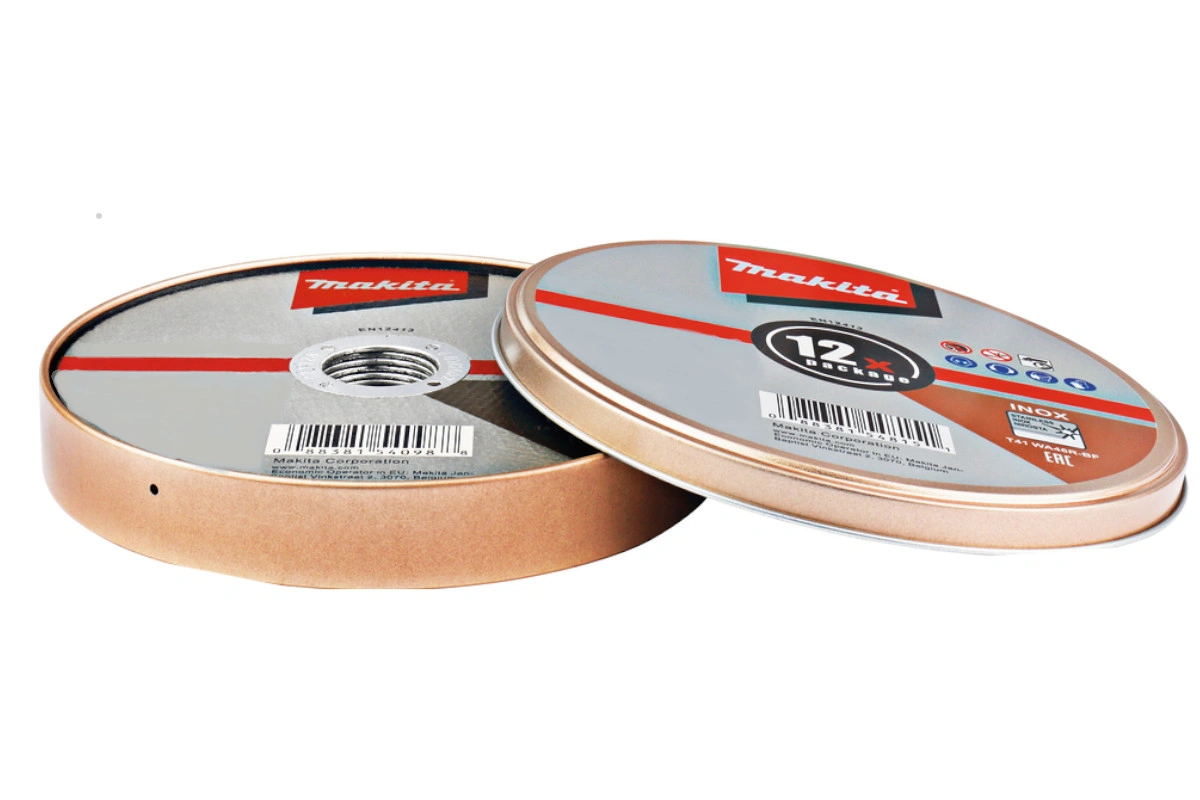 Makita Trennscheibe INOX. Geeignet für 115 mm Winkelschleifer. Max. Drehzahl beträgt 13.300 U/min. Körnung WA46R. 1,2mm Stärke. Bohrung von 22,23mm. Stärke 1,0mm. Für Winkelschleifer; geeignet für Inox, Stahl & Edelstahl. Erhältlich in robuster und praktischer Metalldose. 12 Trennscheiben pro Metalldose.