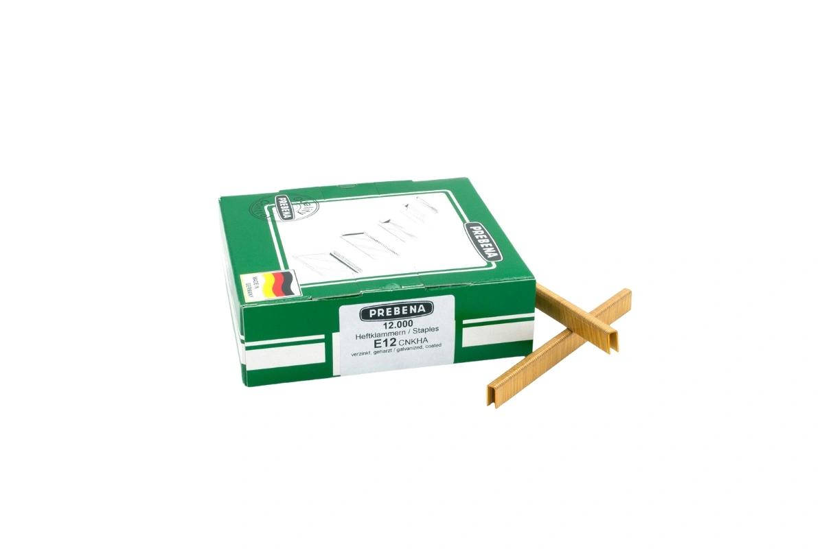 Prebena 12mm Heftklammern Typ E, verzinkt, geharzt. 12.000 Stück pro Schachtel. Rückenbreite (mm) 5,7, Drahtmaß (mm) 1,0 x 1,25. Mengenangabe pro Schachtel. Wird verarbeitet in: Druckluftnagler 3GP-E40 15-40mm