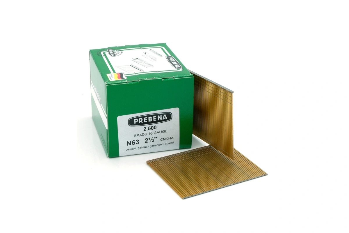 Prebena 63mm Stauchkopfnägel (Brads) verzinkt Stahl, geharzt. 2.500 Stück pro Schachtel. C-Schnitt, Drahtmaß (mm) 1,36 x 1,65, Nagelkopf (mm) 2,8 x 1,3. Mengenangabe pro Schachtel. Wird verarbeitet in: Druckluftnagler 3GP-N65 20-65mm