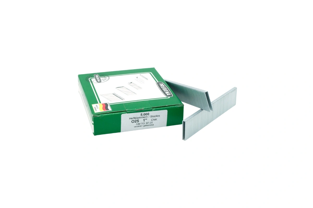 Prebena 25mm Heftklammern Typ O, verzinkt. 5.000 Stück pro Schachtel. Rückenbreite (mm) 4,5, Drahtmaß (mm) 0,66 x 0,95. Mengenangabe pro Schachtel. Wird verarbeitet in: Druckluftnagler 1M-O25SDS-S10 8-25mm