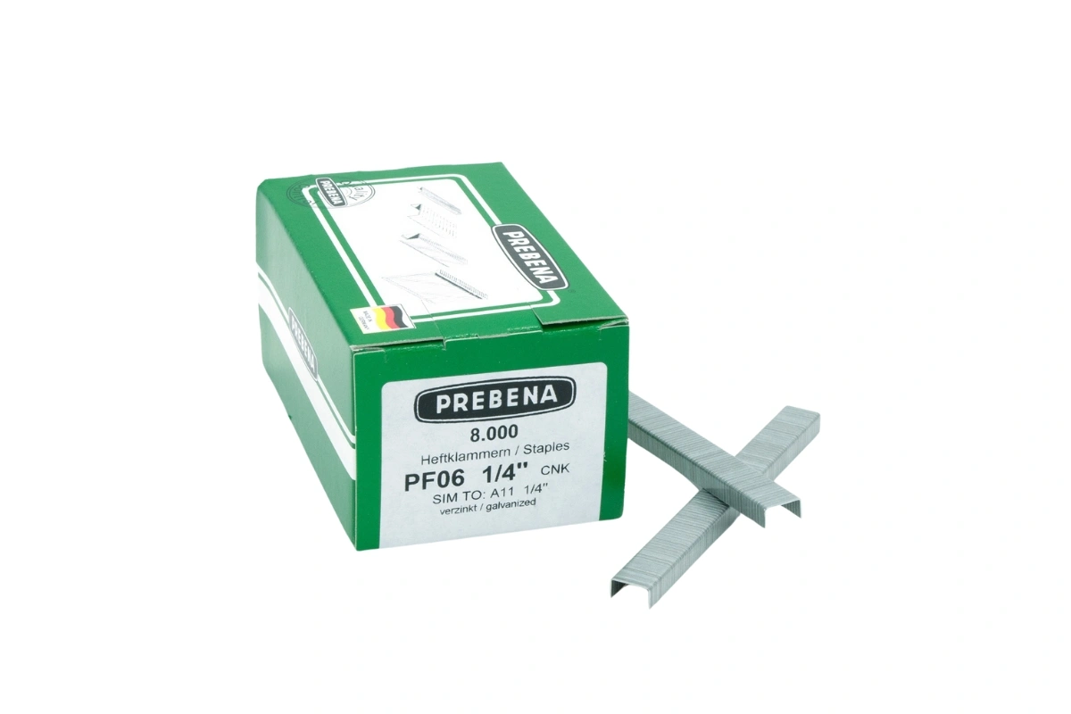 Prebena 6mm Heftklammern Typ PF, verzinkt. 8.000 Stück pro Schachtel. Rückenbreite (mm) 10,6, Drahtmaß (mm) 0,5 x 1,27. Mengenangabe pro Schachtel. Wird verarbeitet in: Druckluftnagler DNPF16 6-16mm